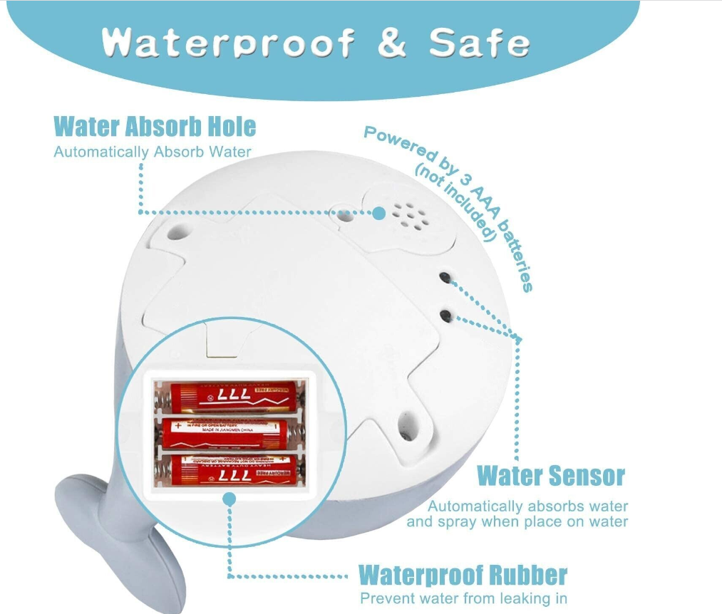 Easy to Use --The infant tub toys powered by 3 AAA batteries(not included). Water toy has a automatically senses, just install the batteries, and place it on the water, it will automatically induction absorbs water from the bottom and sprays appropriate height water column. When leaves water, all effects will stops immediately. No manual operation is required.(Notice:Please take baby toy out when not in use and dry the water above.)