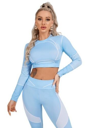 Blue 2 Piece Long Sleeve Fitted Graphic Yoga Gym Work Out Set For Women