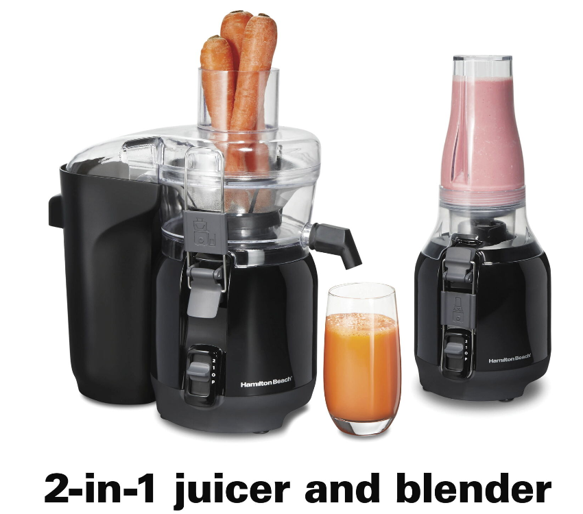 Juicing and blending go hand-in-hand as part of a healthy lifestyle, and now you can juice and blend with one space-saving appliance. Thanks to its versatile 2-in-1 design, the Hamilton Beach Big Mouth® Juice & Blend 2-in-1 Juicer and Blender makes fresh juice from whole fruits and vegetables, which you can add to all your favorite blended recipes. You’ll save time as you juice because the 3" Big Mouth® chute fits whole produce, and by replacing the juice extractor attachment with the 20 oz. blender jar, you can juice directly into it — no need to transfer juice from one container to another. With this versatile 2-in-1 appliance, you can go from making simple juice to creating a wide variety of flavorful smoothies, shakes, cocktails or slushies. You'll easily power through tough ingredients like hard produce and ice with its 800 watt, 2 speed motor and pulse. Amp up your nutrition and add more flavor to your life today — recipes are included to get you started. Includes patented Easy Sweep™ cleaning tool and removable, dishwasher safe parts for easy cleanup. Backed by Hamilton Beach, the #1 brand in juice extractors