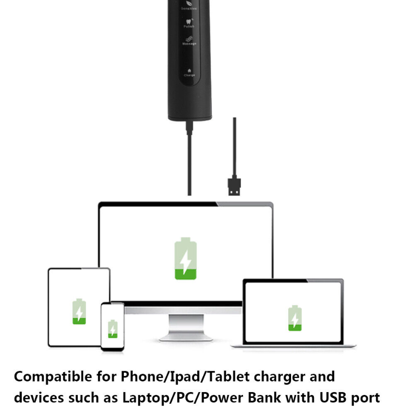 4 hours charge for minimum 30 days use, you can bring the brush without a charger when you are traveling.USB charging, safe and easy, auto shut off after full charge, compatible with any charger or equipment with a USB port.