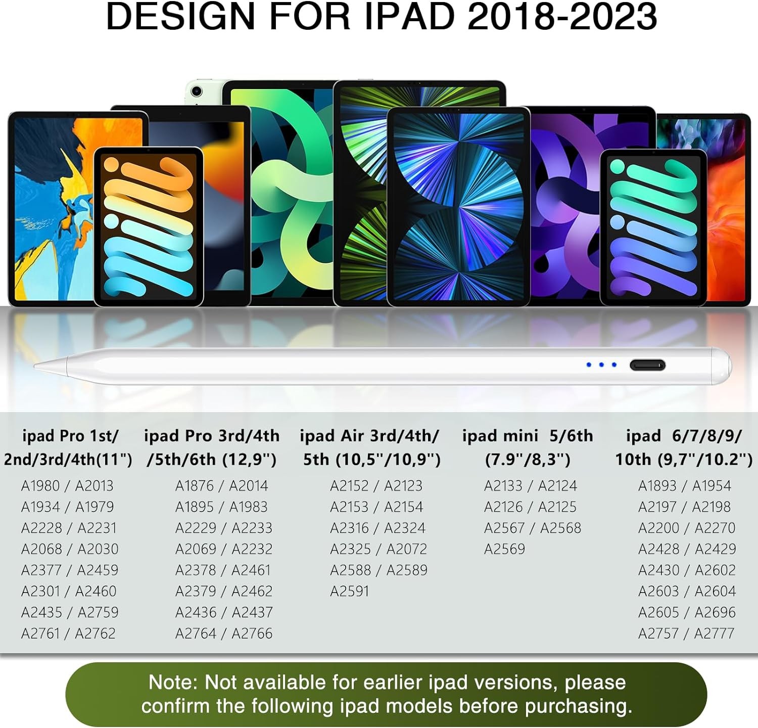 • DESIGNED FOR IPAD 2018-2023 –– The ipad pencil is compatible with ipad 9.7" and 10.2" (6/7/8/9/10 generation), ipad Air (3/4/5 generation), ipad Mini (5/6 generation), ipad pro 11" (1/2/3/4 generation) and 12.9"(3/4/5/6 generation), which definitely the best alternative to apple pencil 1st/2nd generation.