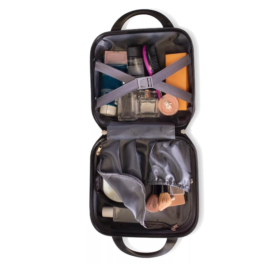 - The cosmetic case offers ample room with a vanity mirror, dividers, and an organizer for your beauty essentials